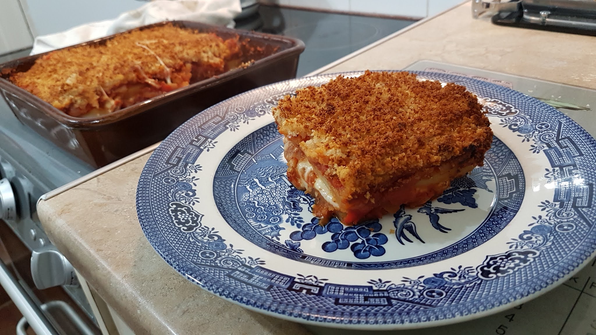 In a large oven dish place a layer of potatoes, then cover with the ragu and slices of mozzarella and grated parmesan, then add another layer of potatoes, cover with sauce and then the breadcrumbs. Cover with foil and put it in an oven for 30 mins, then uncover and return to the oven till the breadcrumbs are golden.