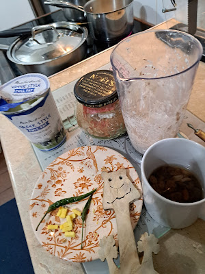 Add the paste to the dish and the sultanas and their liquid, add another chopped chilli, some julienned fresh ginger and tsp of garam masala, mix and simmer for a minute then switch off the heat. Turn chicken over and mix then a minute of two later add a few tblsp of yogurt, mix again and serve.